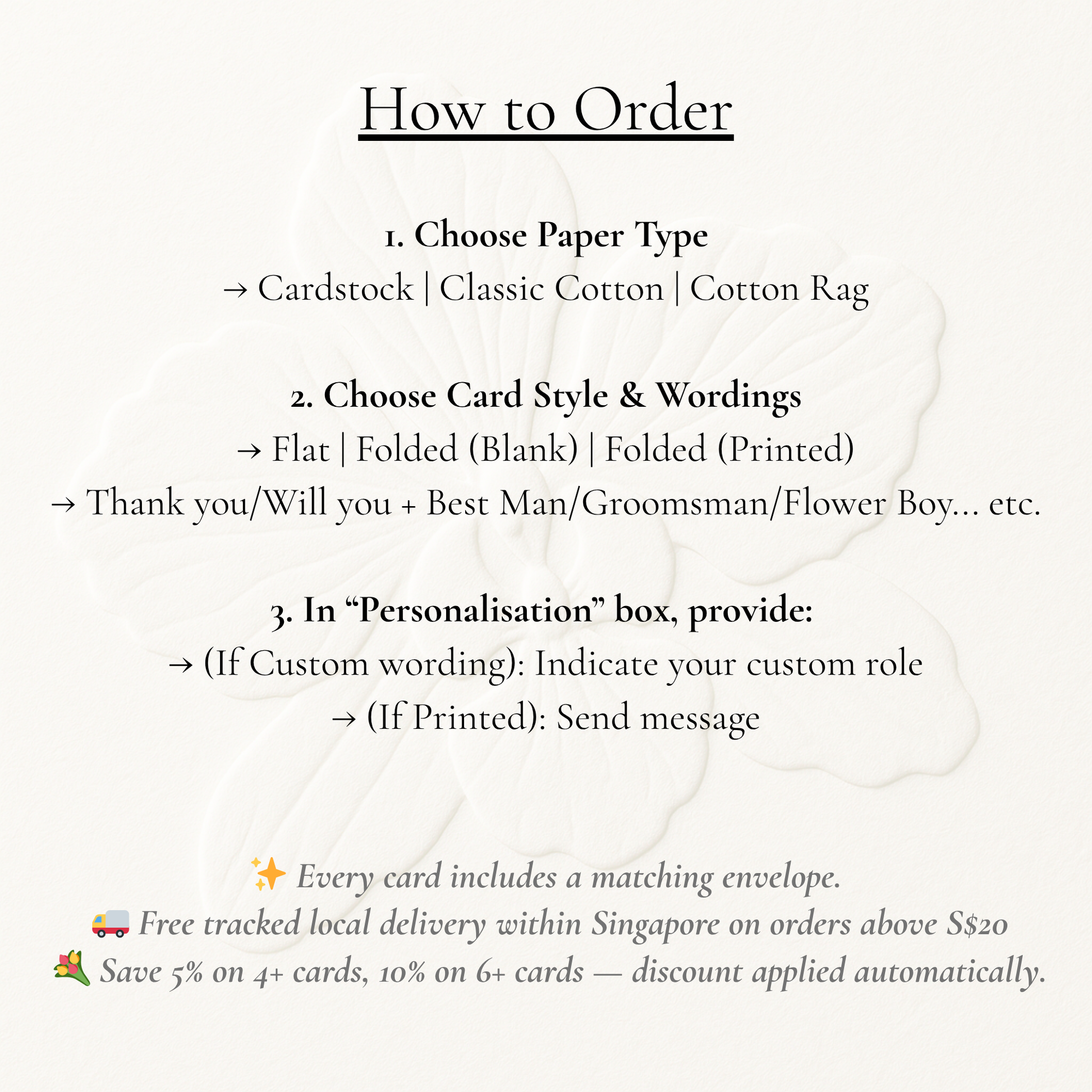 Prices range from S$6 for flat cardstock to S$11 for premium cotton rag folded cards with printed messages - simply choose the paper and style that best suits your bridal party.