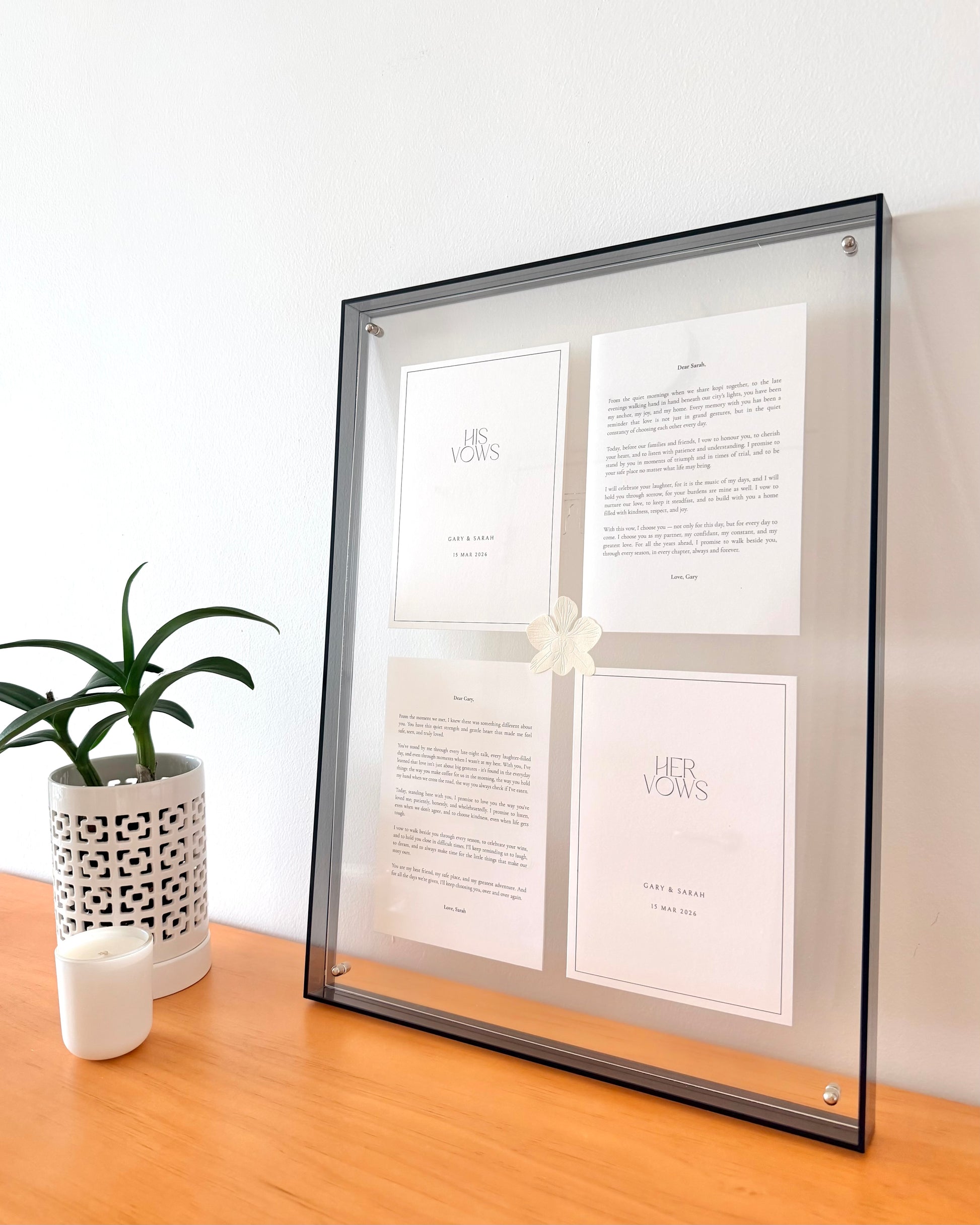 Thoughtfully styled to hold two vow cards, the modern high quality acrylic frame creates a balanced, gallery-like presentation that feels calm, intentional, and timeless. Perfect for bedrooms, living rooms, or private study corners.